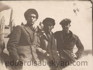 1934. Ընկերներով — գրող Գուրգեն Բորյան, Պիոներ կանչ թերթի խմբագիր Սերոբ Սարգսյան, Էդուարդ Իսաբեկյան